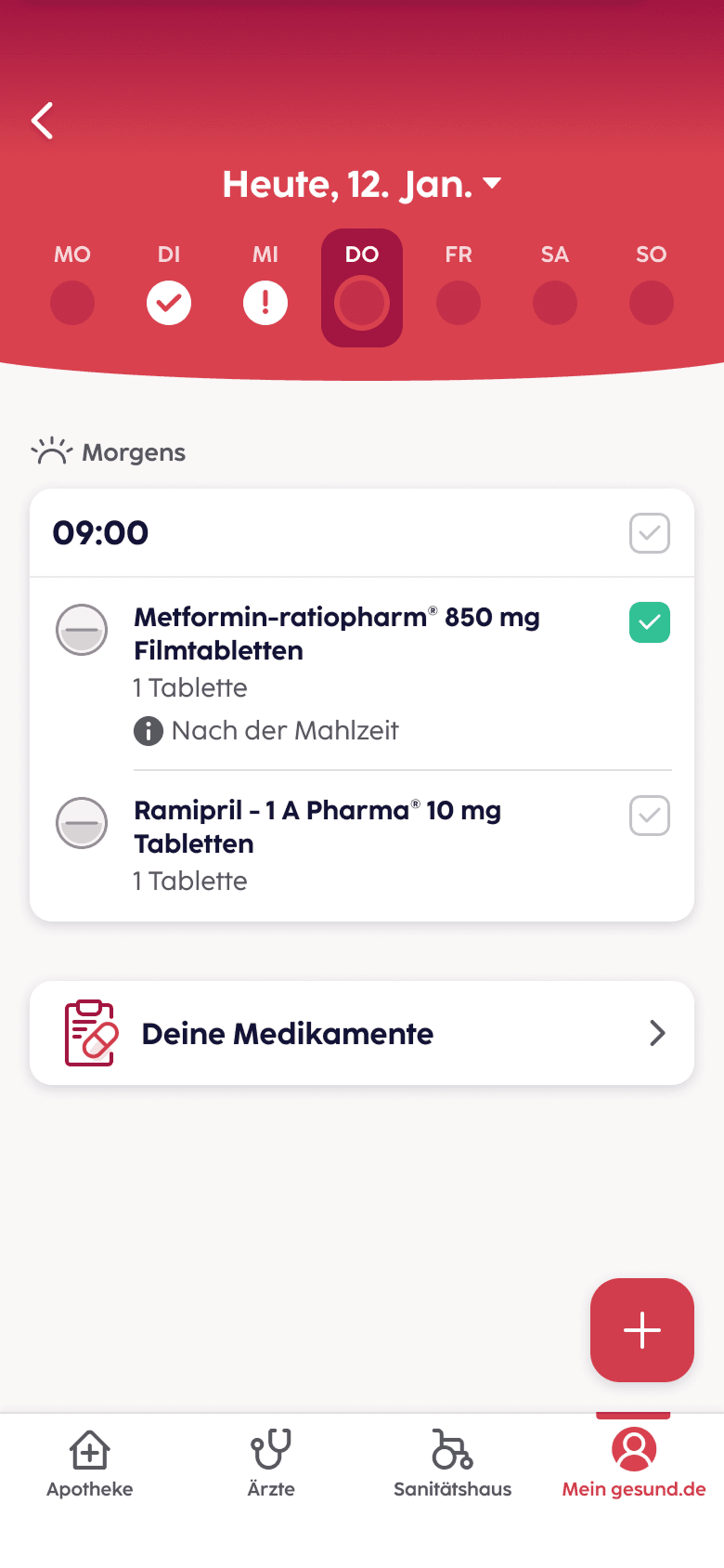 Morgens, mittags, abends - gesund.de erinnert dich zuverlässig an deine Medikamenten-Einnahme. Hast du deine Medikamente eingenommen, hakst du es einfach ab. So siehst du immer genau, was Sache ist.